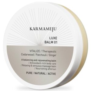 Karmameju LUXE Balm 01 er en rigtig sk�n salve som kan bruges til hele kroppen. Den er med �kologisk oliven- og jojobaolie, som n�rer og plejer t�r hud. Salven virker anti-inflammatorisk og beroliger og lindrer �mme muskler. Nellike og ingef�r �ger blodci