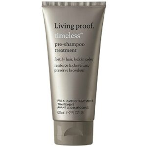 Living Proof Timeless Pre-Shampoo Treatment er et forsvar mod aldersrelaterede �ndringer i h�ret. Shampooen indeholder den advancerede shampoo-aktiverede farve-forseglings teknologi samt UV-filter. Den styrker h�ret og holder samtidig farven smuk og leven