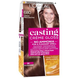 L'Or�al Paris Casting Cr�me Gloss 680 M�rkeblond Mocca er en plejende brun toningsfarve uden ammoniak. Det er en ultra glansgivende hjemmefarve, som d�kker gr� h�r op til 70% og giver silkebl�dt h�r. Den er velegnet til naturligt, stribet og farvet h�
